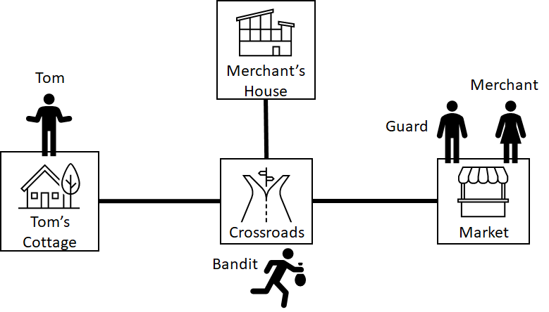 Tom is sick, and he needs a special potion from the merchant who works at the market. Tom's cottage is connected to the market via a crossroads which also connects to the merchant's house.